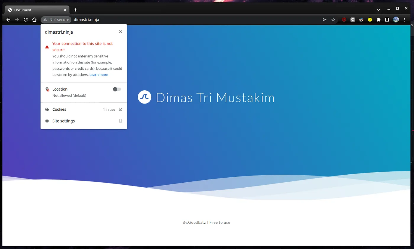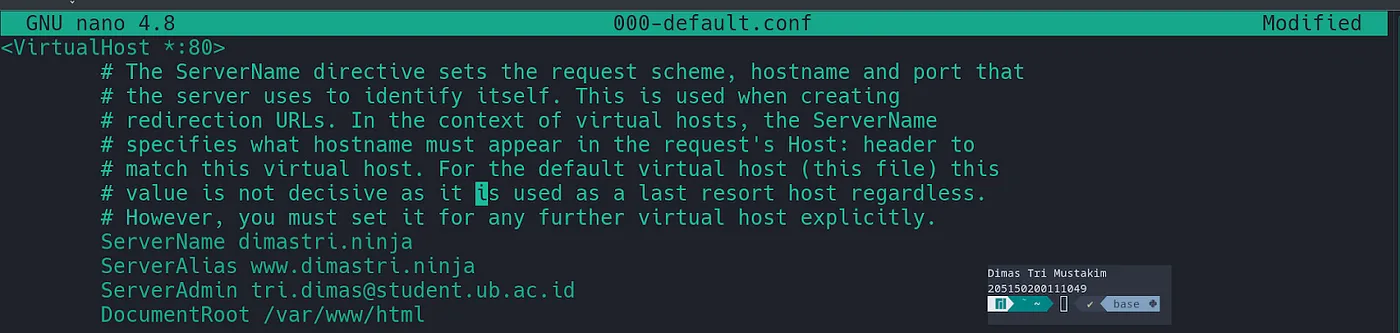 Letsencrypt hanya mau mengisukan sertifikat ke website yang telah punya nama domain, sehingga saya perlu untuk mendapatkannya. Saya menggunakan domain yang disediakan name.com dengan nama domain dimastri.ninja. Untuk melakukan praktik ini, saya reset kembali konfigurasi apache2 dan setelah itu saya konfigurasi virtual host dari apache untuk menggunakan nama domain yang saya miliki menjadi seperti screenshot berikut.