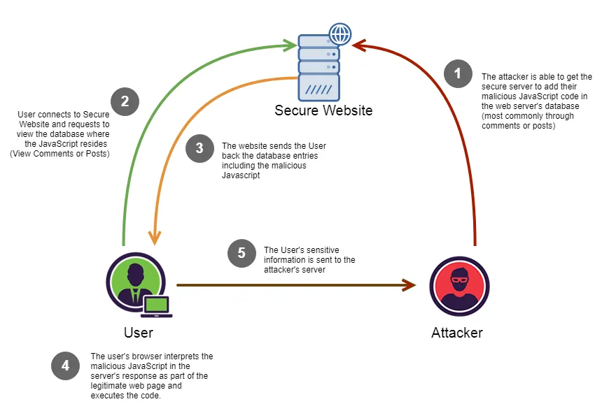 Stored XSS merupakan jenis XSS yang paling merusak. Dalam stored XSS, skrip yang disuntikkan akan disimpan secara permanen di server target, seperti database, forum pesan, visitor log, dan lain-lain.
