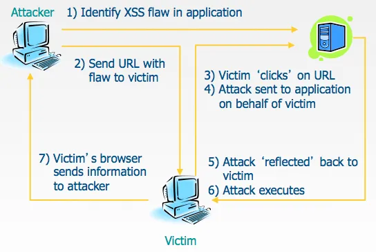 Reflected XSS terjadi ketika skrip berbahaya dipantulkan dari web aplikasi ke browser korban. Dapat terjadi ketika input pengguna yang tidak divalidasi dan tidak tersaring lolos sebagai bagian dari output HTML. Serangan yang berhasil dapat memungkinkan penyerang untuk mengeksekusi HTML dan JavaScript di browser korban.