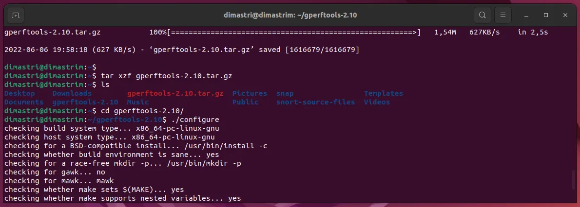 tar xzf gperftools-2.10.tar.gz && cd gperftools-2.10/c. Menjalankan file configure