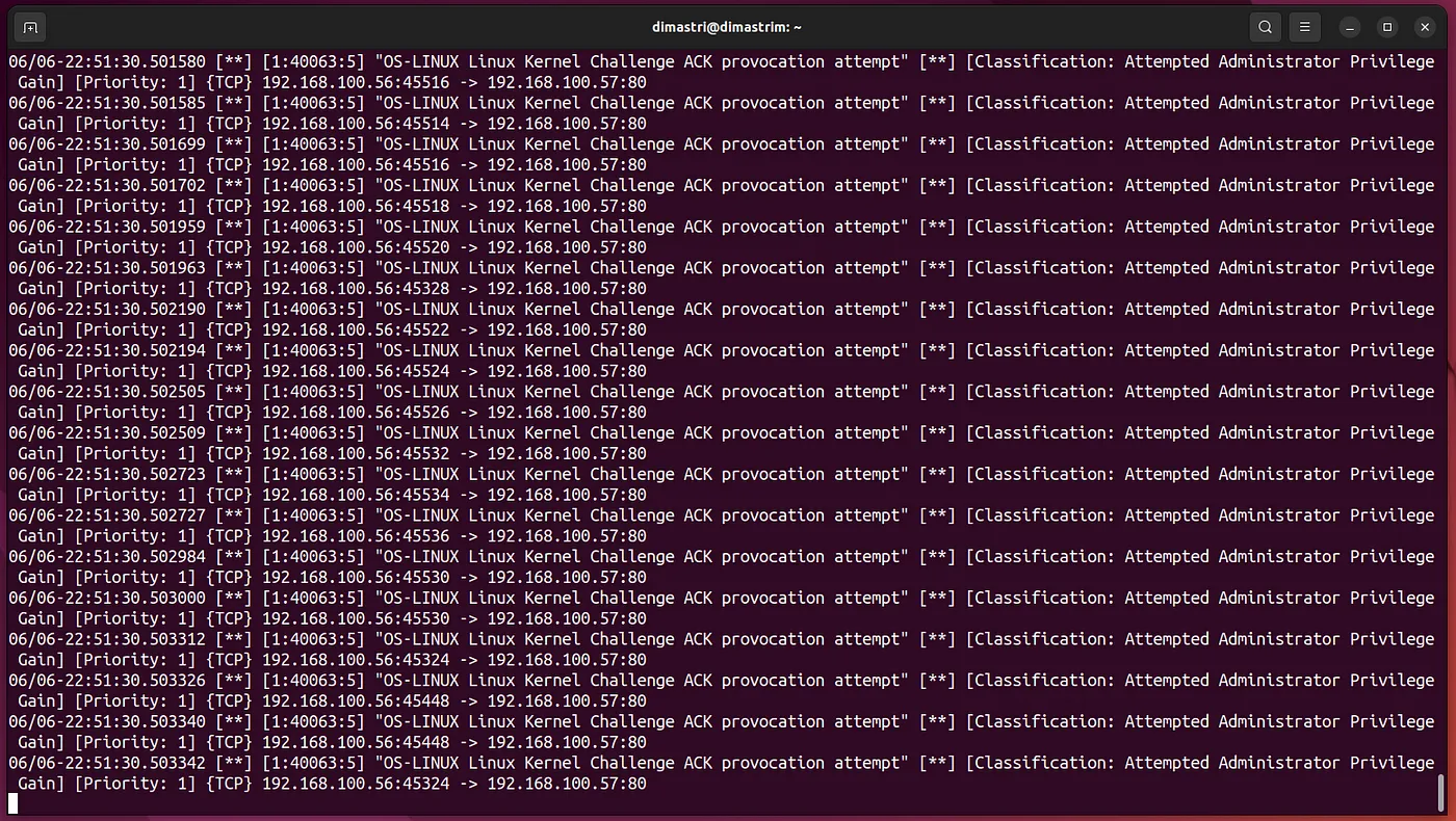 Terdapat banyak sekali alert yang muncul. Alert tersebut berisi pesan “OS-LINUX Linux Kernel Challenge ACK provocation attempt” dengan klasifikasi “Attempted Administrator Privilege Gain” dengn prioritas 1. Pada saat DOS tersebut terjadi saya juga cek apakah web bisa dibuka dan ternyata tidak. Hal ini juga menunjukkan Snort dalam mode IDS tidak mencegah serangan.