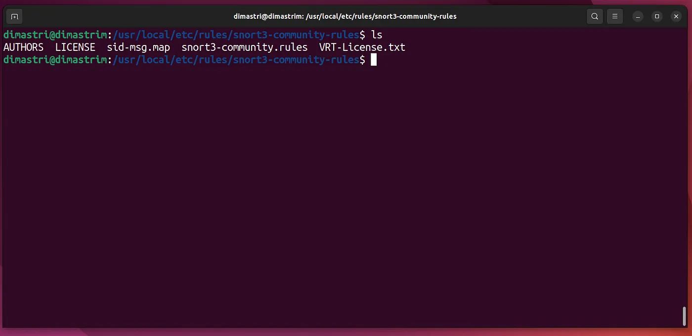 Di dalam snort, rulesets merupakan keuntungan utama dari mesin pendeteksi intruksi. Terdapat beberapa tipe dari snort rules yaitu contohnya adalah community rulesets, registered ruleset, dan subscriber ruleset. Community rulesets dikembangkan oleh komunitas snort dan dicek kualitasnya oleh Cisco Talos. Community ruleset tersedia secara gratis untuk semua user. Disini saya akan menggunakan community ruleset ini. Berikut langkah yang saya lakukan untuk menginstall community rulesets.
