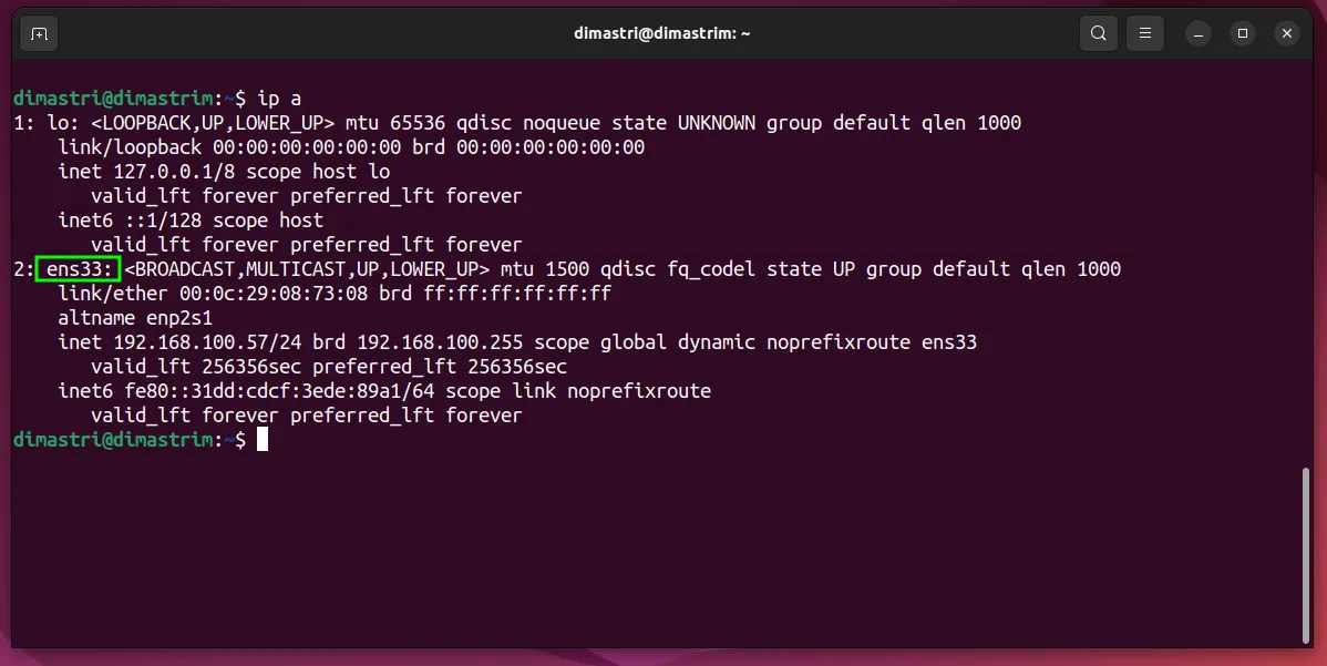Bisa dilakukan dengan menggunakan perintah ip a . Disini interface yang akan saya gunakan bernama ens33.