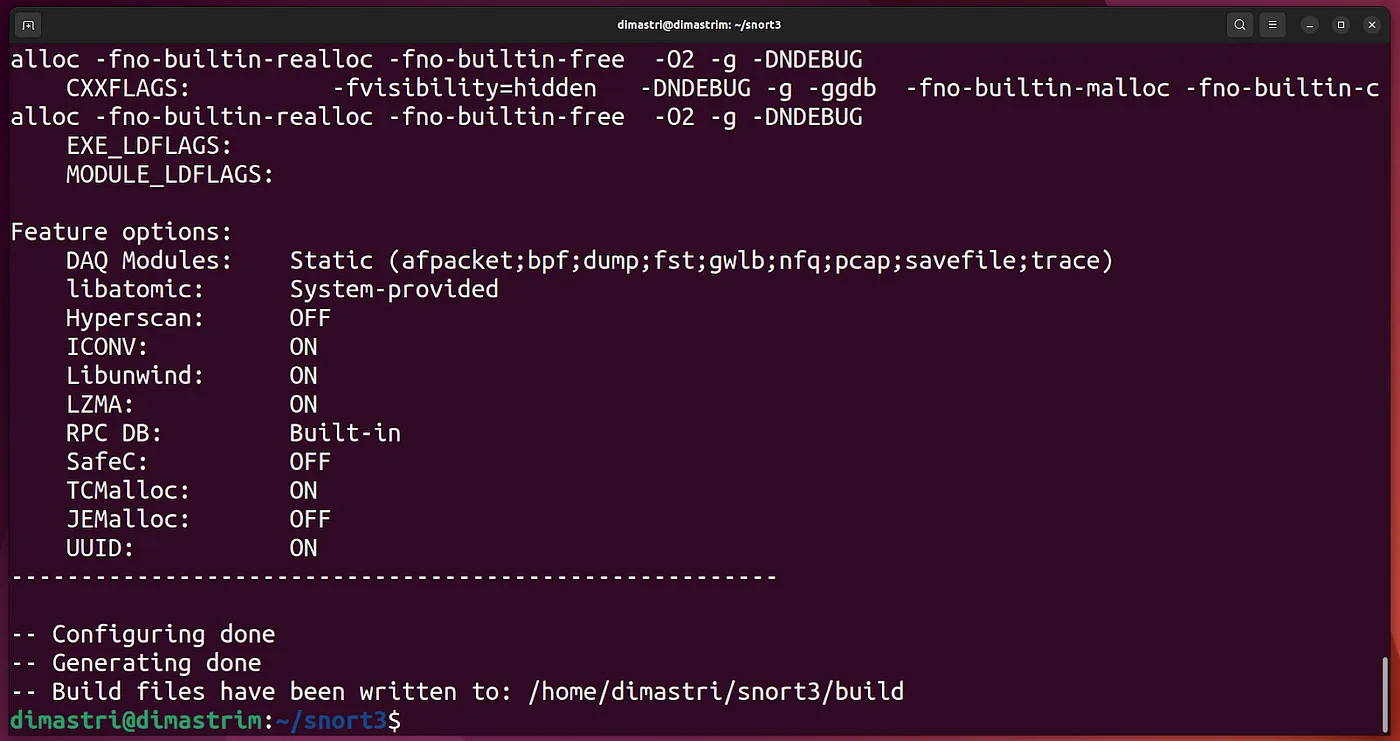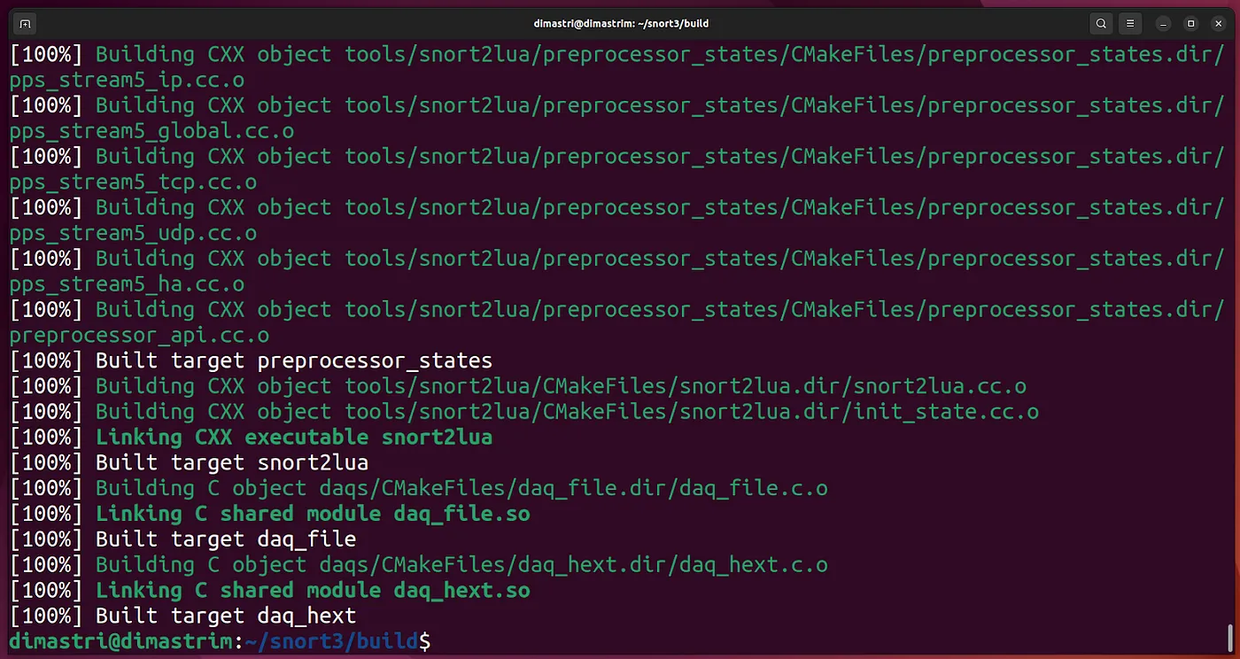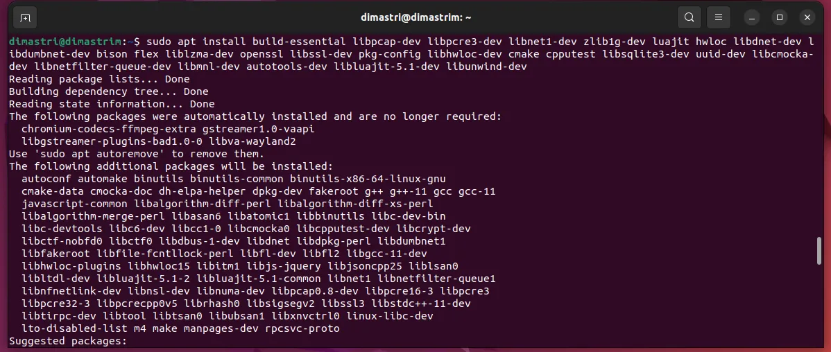 sudo apt install build-essential \ libpcap-dev libpcre3-dev libnet1-dev \ zlib1g-dev luajit hwloc libdnet-dev \ libdumbnet-dev bison flex liblzma-dev \ openssl libssl-dev pkg-config \ libhwloc-dev cmake cpputest libsqlite3-dev \ uuid-dev libcmocka-dev libnetfilter-queue-dev \ libmnl-dev autotools-dev libluajit-5.1-dev libunwind-devBerikut screenshot dari instalasi dependency tersebut.