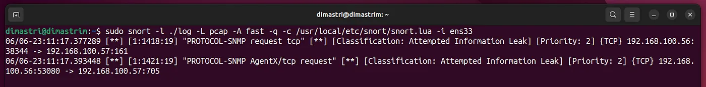 sudo snort -l ./log -L pcap -A fast -q -c /usr/local/etc/snort/snort.lua -i ens33Parameter -l digunakan agar log file disimpan di folder ./log dan -L menyatakan untuk log file dalam format pcap dan -A (alert) dalam mode fast (karena console tidak bisa di saya) . Kemudian -q menyatakan quiet mode agar proses startup snort tidak ditampilkan, -c untuk menyatakan file konfigurasi yang akan digunakan, dan terakhir -i untuk menspesifikan interface yang akan dimonitor.