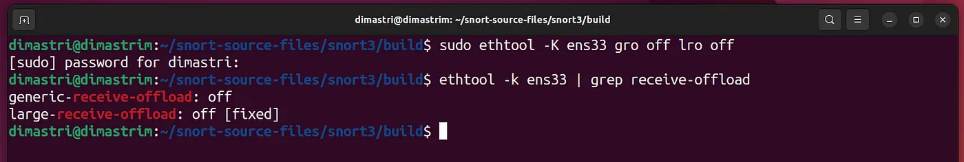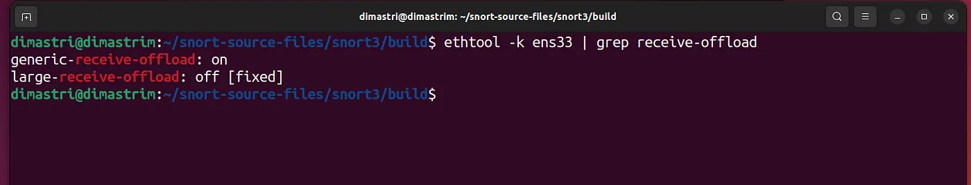 ethtool -K ens33 gro off lro offDigunakan untuk mencegah snort 3 memotong paket besar. Pertama saya cek apakah fitur ini diaktifkan dengan menggunakan perintah.