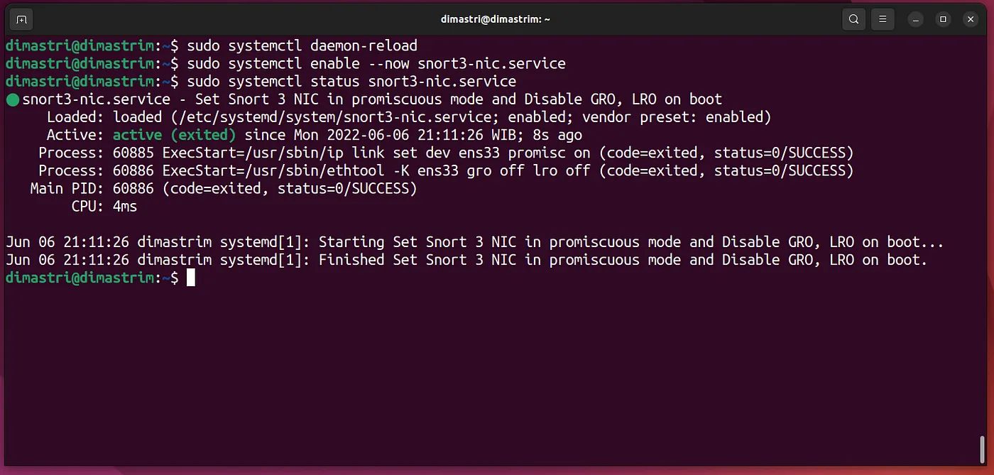 sudo systemctl enable — now snort3-nic.serviceKemudian terakhir kita bisa memverifikasi apakah service tersebut telah berjalan dengan baik menggunakan perintah berikut