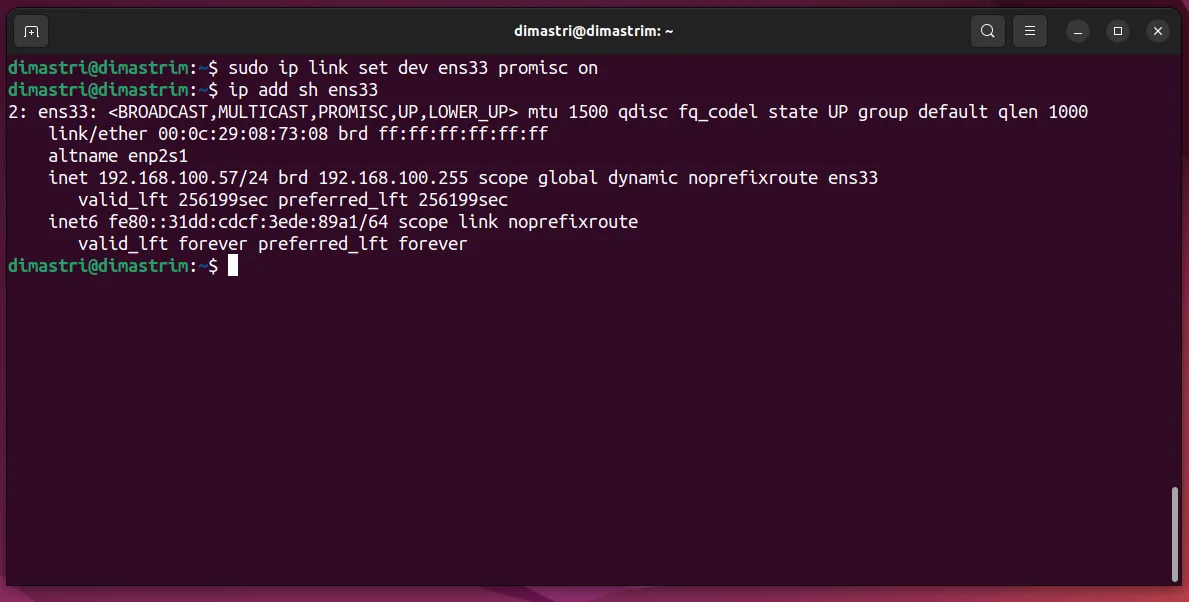 ip link set dev ens33 promisc onKemudian dapat diiverifikasi menggunakan perintah