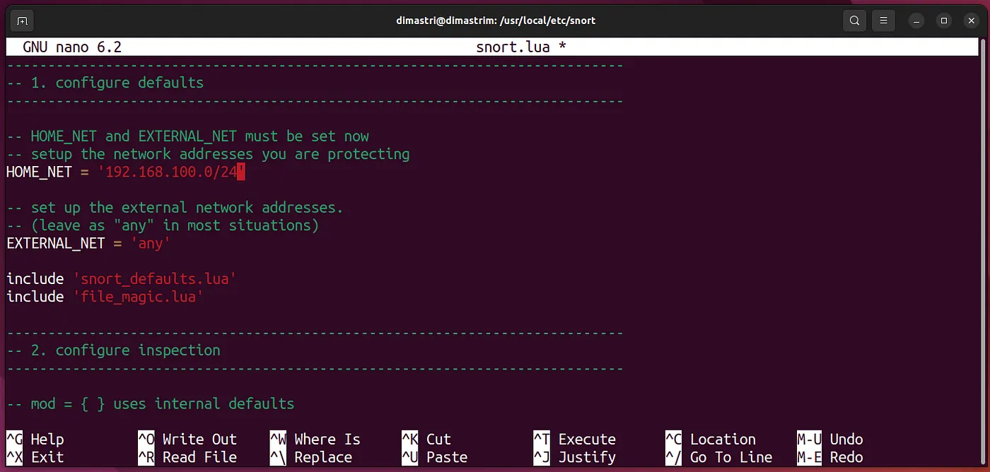 File snort.lua berisi konfigurasi utama Snort yang memungkinkan implementasi dan konfigurasi preprocessor dari snort, penyertaan file rule, event filter, output, dan sebagainya. File tersebut terletak di folder /usr/local/etc/snort. Disini saya atur variable HOME_NET untuk mencakup jaringan yang ada di rumah saya yaitu 192.168.100.0/24.