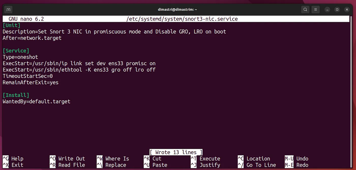 Pertama saya buat file /etc/systemd/system/snort3-nic.service dan diisi dengan konfigurasi serperti berikut.