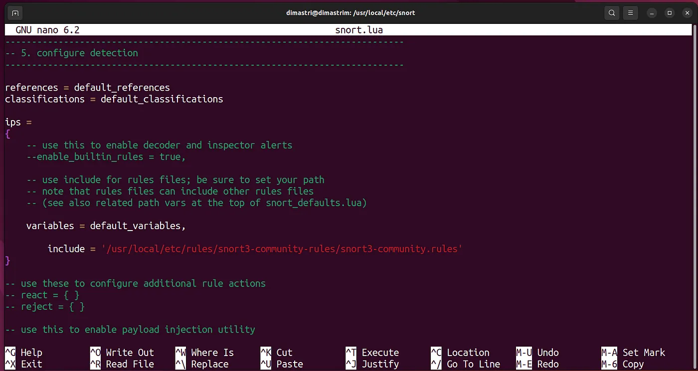 File snort3-community.rules yang telah didownload sebelumnya dilakukan include di bagian ips di dalam file snort.lua seperti pada screenshot berikut.