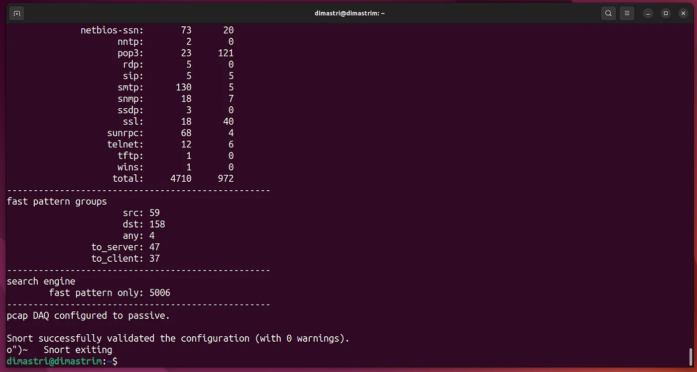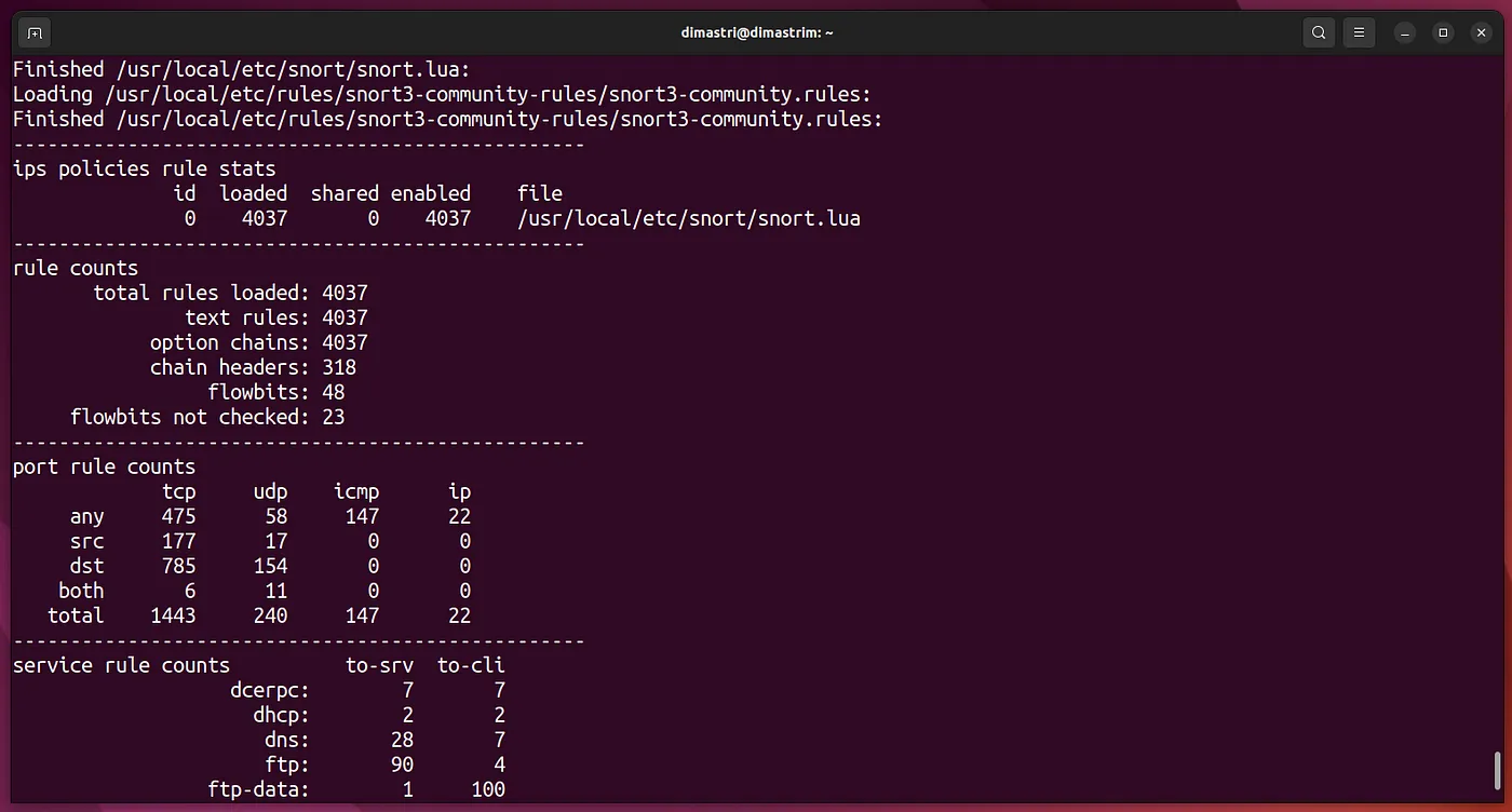 sudo snort -T -i ens33 -c /usr/local/etc/snort/snort.luaParameter -T akan melakukan pengecekan terhadapa konfigurasi yang dibuat dan akan mengeluarkan output yang panjang seperti berikut.