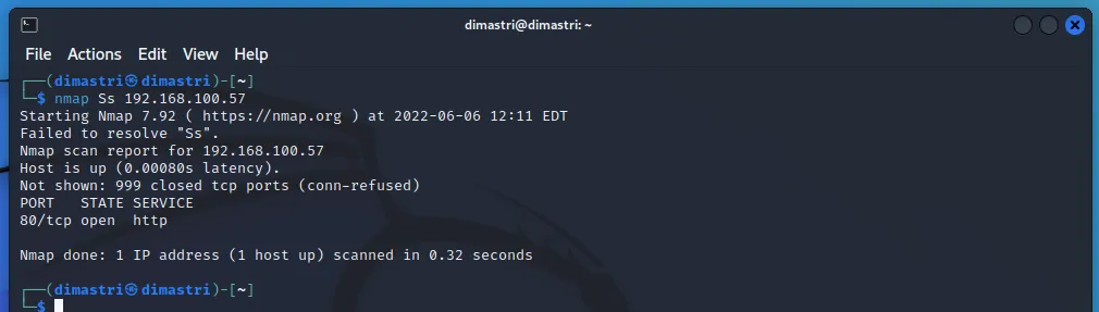 Disini saya melakukan TCP SYN scan menggunakan nmap seperti berikut.